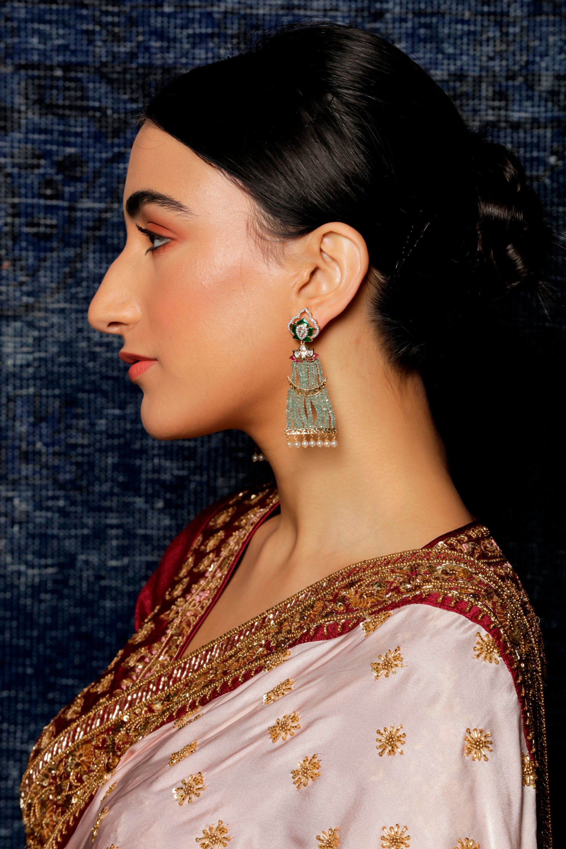 Polki Earring is a refined pair of earrings that fuse traditional Polki-inspired design with modern sparkle. Crafted for jewelry lovers who appreciate heritage aesthetics and everyday versatility, these earrings glow with Cubic Zirconia and lab-grown Polki stones set in a 92.5 sterling silver base plated in gold.